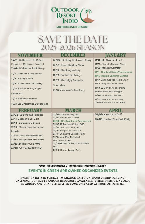 From pickleball rallies and golf scrambles to wellness classes, social gatherings, and seasonal celebrations, life at Outdoor Resort Indio is full of activity, energy, and connection.